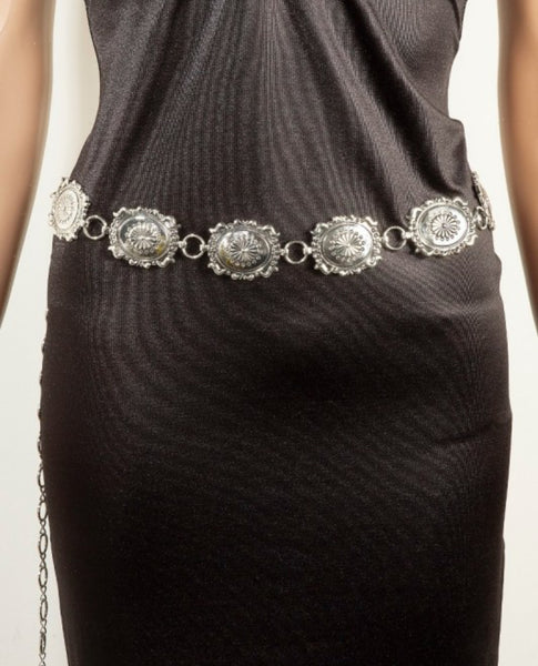 Add a touch of Western charm to your look with this statement concho belt. Designed with vintage-inspired engraved medallions linked together, it features an adjustable chain closure for a custom fit. Available in both antique gold and silver finishes, this versatile belt pairs perfectly with dresses, skirts, or denim for a bold and stylish accent.