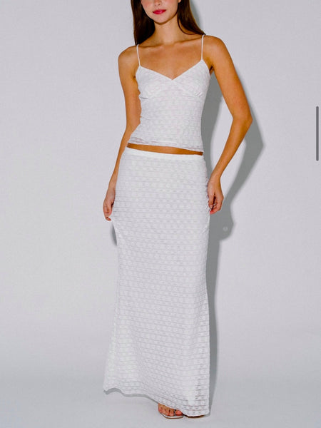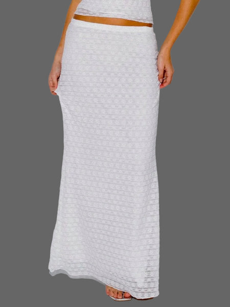 white textured maxi skirt with a sleek, body-skimming fit. Lightweight stretch fabric makes it comfortable while keeping a clean, minimal look.