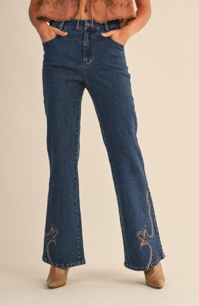 These dark-wash flared jeans bring a subtle western touch with tan embroidered detailing along the lower legs. High-waisted fit with a classic 5-pocket design, a comfortable structured denim feel, and a flattering flare that pairs perfectly with boots or heels.