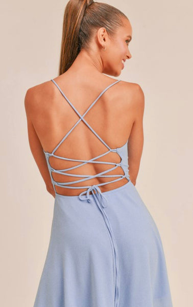 dreamy light blue sparkly mini dress featuring a soft cowl neckline and delicate spaghetti straps. The fit-and-flare silhouette creates a flattering flow, while the open lace-up back adds a flirty touch with adjustable ties for the perfect fit. Lightweight and breezy, it’s a versatile piece that can easily go from day to night.