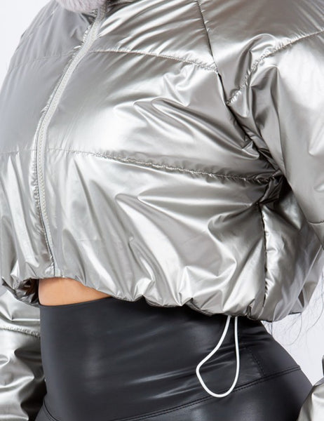 Shine bright even on the coldest days with this chic metallic puffer jacket. Designed with a cropped fit and high collar, it brings the perfect mix of warmth and statement style. The glossy gold finish catches the light beautifully, while the playful faux-fur pom detail adds a fun, trendy touch.
